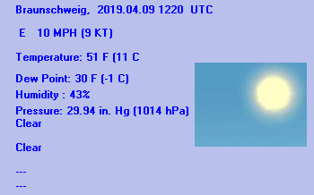 | Windchill Temperatur | 14.2°C | Windspitzen (letzte Std) | 20.8 kmh (11.3 kts) um: 09:11 |