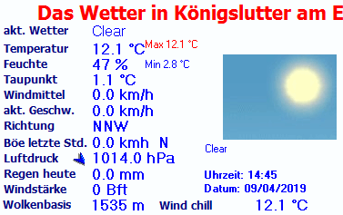 | Luftfeuchtigkeit | 53 %, Humidex 13.4°C | Aktueller Luftdruck (auf Meereshöhe bezogen) | 1019.0 hPa |